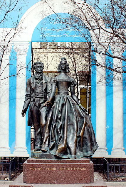 Расположение на этом месте скульптуры символично — мы видим только что повенчанных молодых, которые рука об руку стоят напротив дома, где проживут первые три месяца своей совместной жизни. Скульпторы и архитекторы постарались максимально правдоподобно воссоздать внешний вид героев скульптуры. Александр Пушкин ростом немного ниже своей спутницы, 18 летней красотки Натальи, которая младше своего мужа на 13 лет. Все мы знаем, что брак этот стал роковым для поэта. Горячая любовь к красавице жене привела великого мастера слова к печальной кончине на дуэли.