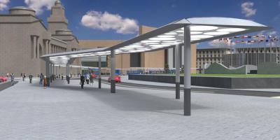 Работы по благоустройству проводятся на территории, прилегающей к Киевскому вокзалу. Тут будет установлено девять навесов, которые должны защищать пассажиров от погодных явлений во время пересадки на метро, наземный общественный транспорт или такси.