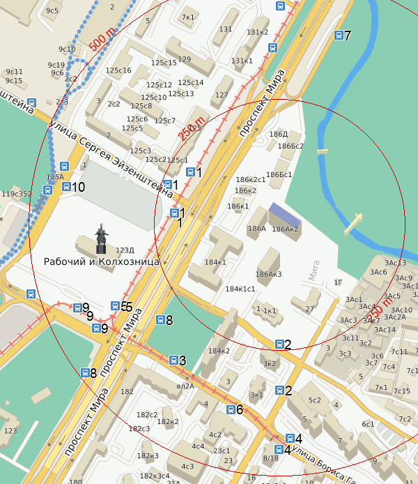 Подробная информация о том, как добраться до дома пр-т Мира д. 186А корп. 2 наземным транспортом. Все остановки и автобусы в шаговой доступности от дома. Каким городским общественным транспортом можно доехать от ближайших станций жд или метро.