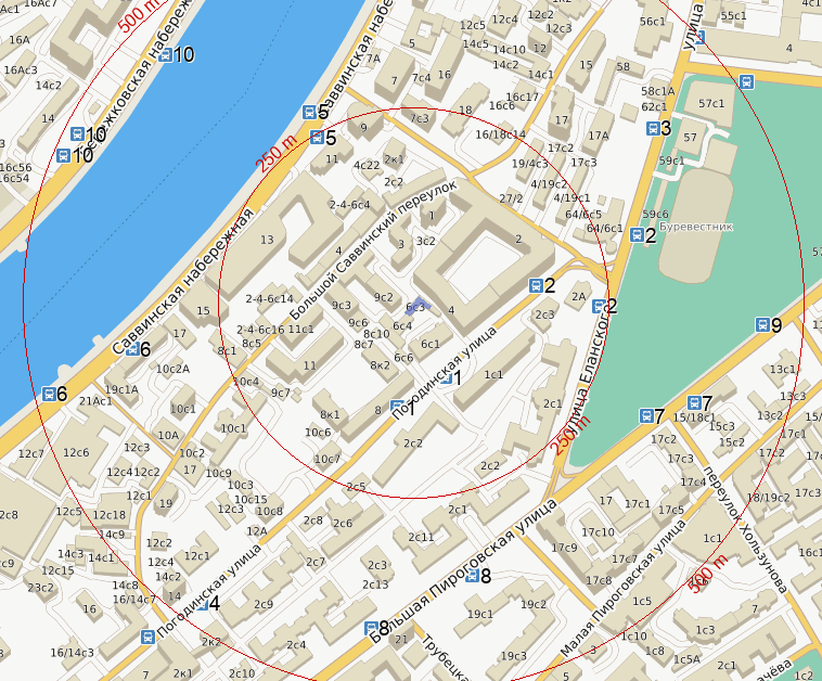 От метро Спортивная : автобусы м6, 220 - 3 остановки, автобусы с216, с755 - 4 остановки